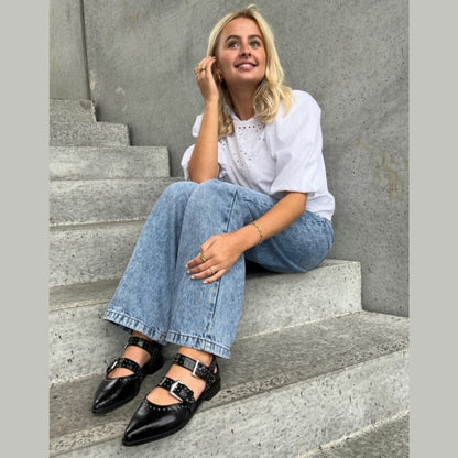 Stylish loafers in patent leather, with two straps that close with buckles. Details with studs. The black model has silver metal buckles and studs. The beige model has gold metal buckles and studs. If you are between 2 sizes, we recommend going up a size. Best suited for narrow/regular feet.Material: leatherSole: TPUInsole: Leather with 4-6 mm Copenhagenshoes foam